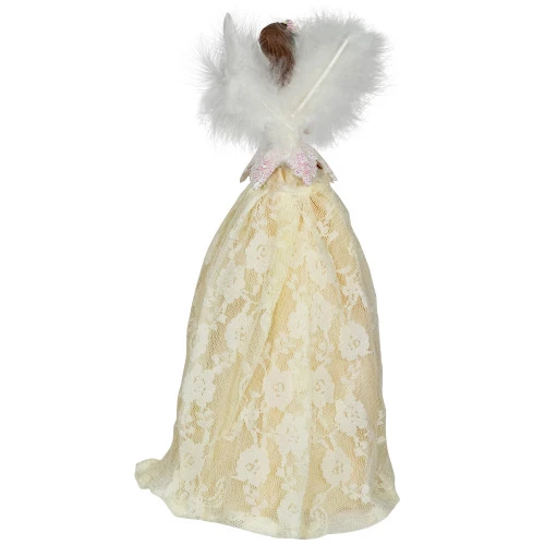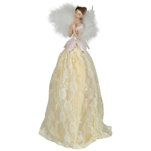 The angel is dressed in a white dress with an ivory sheer overlay accented with vine stitching designs